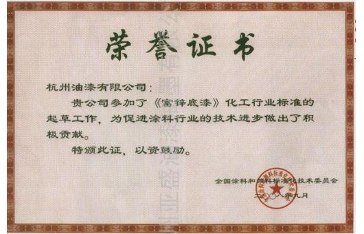 富锌底漆评比荣誉证书